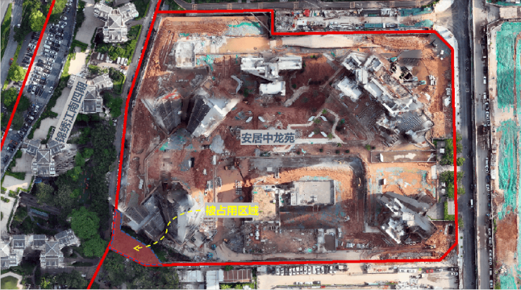 安居集团表示,经核查,锦绣江南四期小区分别侵占了这两宗地约427平方米和3699平方米的土地。具体表现为:中龙苑宗地西南侧被锦绣江南四期部分围墙伸入占用,影响其消防登高面建设;颂龙苑宗地西侧被锦绣江南四期的边坡占用。这导致中龙苑项目南侧部分结构和园林工程无法施工、颂龙苑项目四栋塔楼无法施工,合法开发权益受到严重影响。