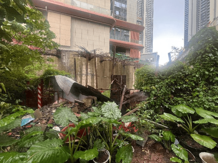 另外,在小区与安居中龙苑宗地的相邻处,有铁皮、木条、空花盆、建筑垃圾、活禽养殖铁笼等杂物堆放,同时可以看到安居中龙苑楼栋一层位置墙面有钢筋预留位。