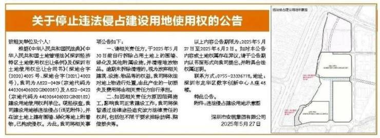 上述《关于停止违法侵占建设用地使用权的公告》称,根据相关法规及出让合同(深地合字(2020)4005号、深地合字(2021)4002号),安居集团是龙华区A822-0409及A822-0422两宗建设用地的权利单位,该建设用地被违法侵占,地上建有围墙、绿化等附着物,构成侵权。要求相关责任方在2025年5月30日前自行拆除清理,逾期将依法处置。