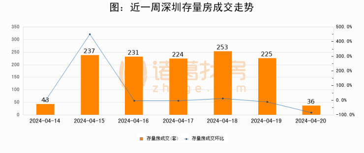 从存量房来看,2024年04月20日深圳存量房单日成交36套,比昨日减少189套,环比下降84%。从近一周存量房成交来看,深圳存量房日均成交套数为178套,04月20日单日成交36套,低于近一周平均水平79.8%。