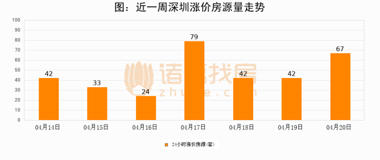 根据诸葛找房数据显示,深圳24小时涨价房源量为67套,较04月19日增加25套,环比上涨59.5%。与此同时,涨价房源占比小幅扩大,业主信心有所提升。