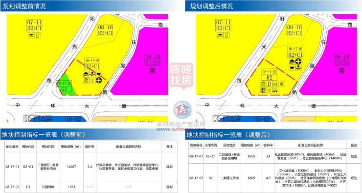 08-17-01地块,用地面积14007㎡,用地性质为二类居住+商业服务业用地,容积率3.4,配套设施包括社区居委会、社区服务站、社区健康服务中心、社区警务室、居住小区级文化室、肉菜市场,备注:规划;08-17-02地块,用地面积1363㎡,用地性质为公园绿地,备注:规划。