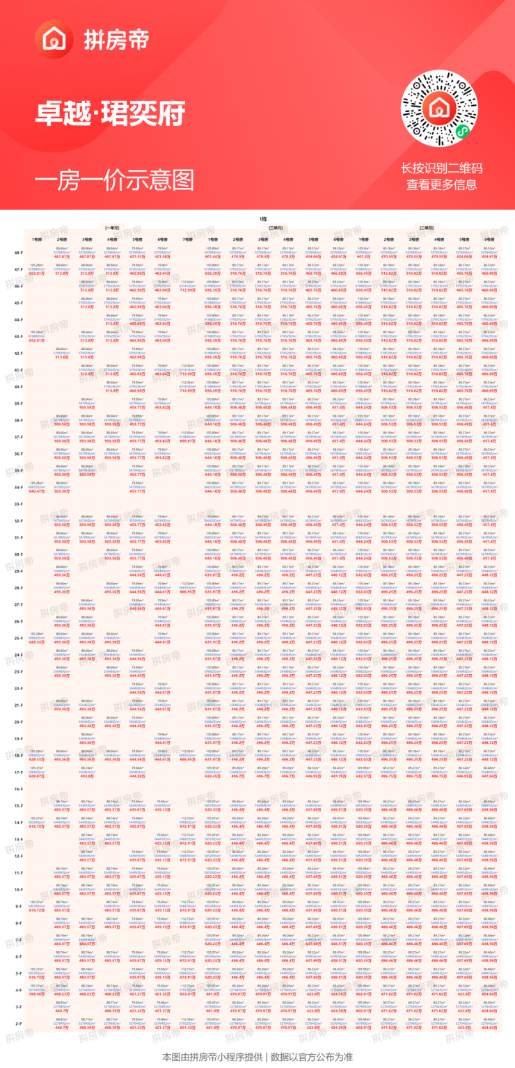 卓越珺奕府共推出735套住宅房源,房源位于1栋1-3单元,主推建面约80-113㎡3-4房,备案单价约5.28-6.31万/㎡,整体均价约5.65万/㎡,备案总价约421-713万/套。