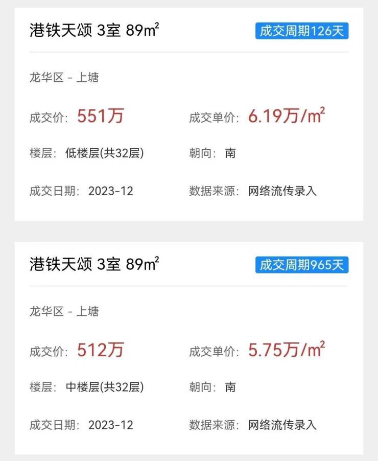 而二手房港铁天颂,参考价为6.85万/㎡,根据行舟深房小程序统计的成交记录显示,近期港铁天颂有成交的二手房均价大概在6万/㎡左右。相比之下,卓越珺奕府的价格还是有明显的倒挂。