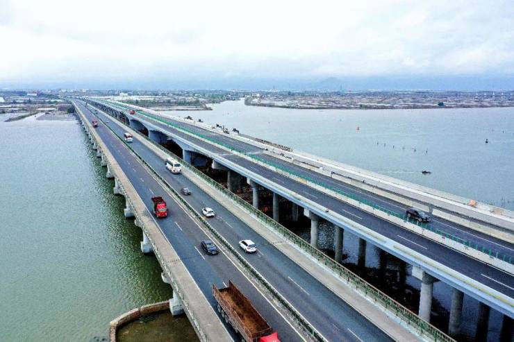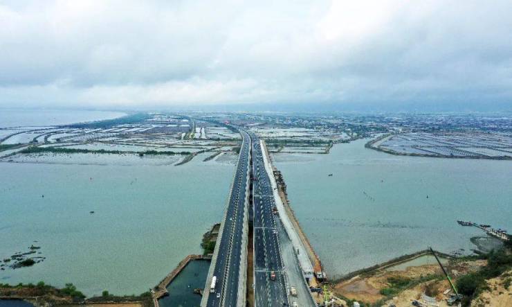 长沙湾跨海特大桥为项目全线控制性工程,全长 2108 米,跨越汕尾市黄江,贯通汕尾海丰县梅陇镇、城区马宫街道两岸,人流密集,同时受洪涝、台风等环境因素影响,施工难度大,工期紧、任务重。