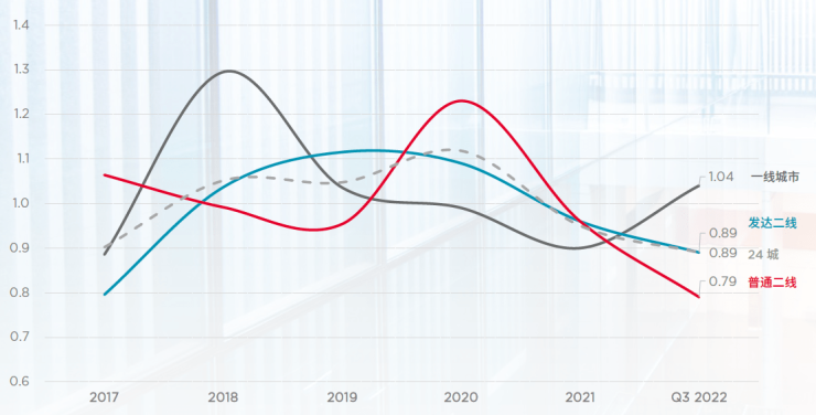 2022年前三季度,24个重点城市一手住宅累计批准上市面积共计11,795万平方米,销售面积共计13,271万平方米,分别较上年同期下降38.4%和37.1%。供销比由去年全年的0.95下降至0.89,反映今年来相较于需求疲软对成交量的拖累,投融资环境、房企资金状况及市场预期变化对供应端的影响更为显著。