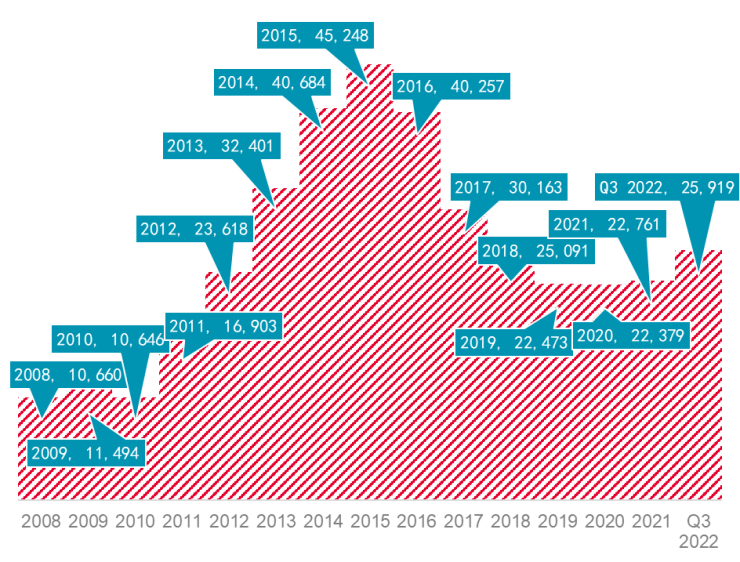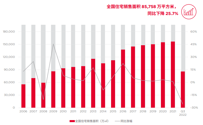 楼市需求整体放缓也令全国住宅待售面积增加至阶段性高位,截至2022年三季度末,全国住宅待售面积25,919万平方米,较上年同期增加15.7%。但三季度末的待售面积较年中减少335万平方米,反映在库存量上的压力稍有缓解。也因此可见在新房成交量持续下滑的同时,受资金面收紧、民企拿地放缓、市场预期不明朗等因素影响,供给端的收缩幅度更大。
