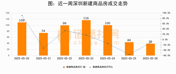 根据深圳市住房和城乡建设局数据显示,2025年05月26日深圳新建商品房成交39套,较昨日减少5套,环比下降11.4%。近一周深圳新建商品房日均成交83套。05月26日单日成交39套,低于近一周平均水平53%。