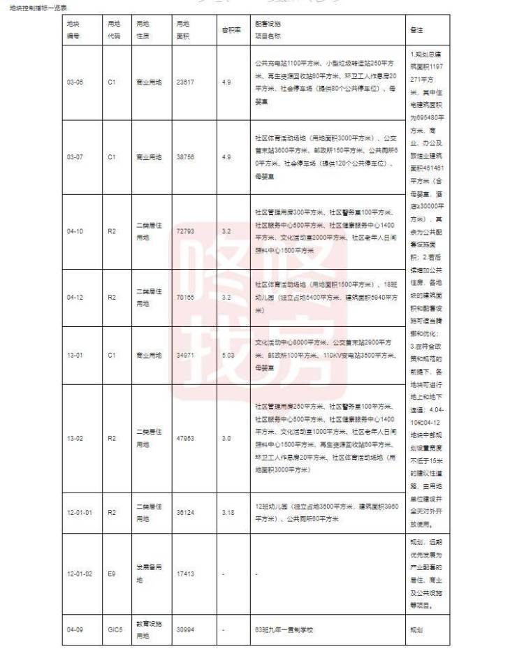 (五)04-12地块面积70165平方米,规划用地性质为二类居住用地,容积率3.2,配套设施项目名称为社区体育活动场地(用地面积1500平方米)、18班幼儿园(独立占地5400平方米,建筑面积5940平方米)。