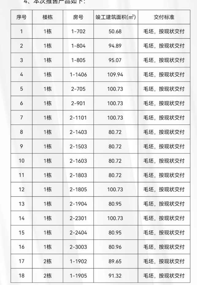 本批所推的18套房源,其中约50㎡单位1套、约80㎡单位7套、约89㎡单位1套、约91㎡单位1套、约95㎡单位2套、约101㎡单位5套、约110㎡单位1套,均为毛坯现状交付。