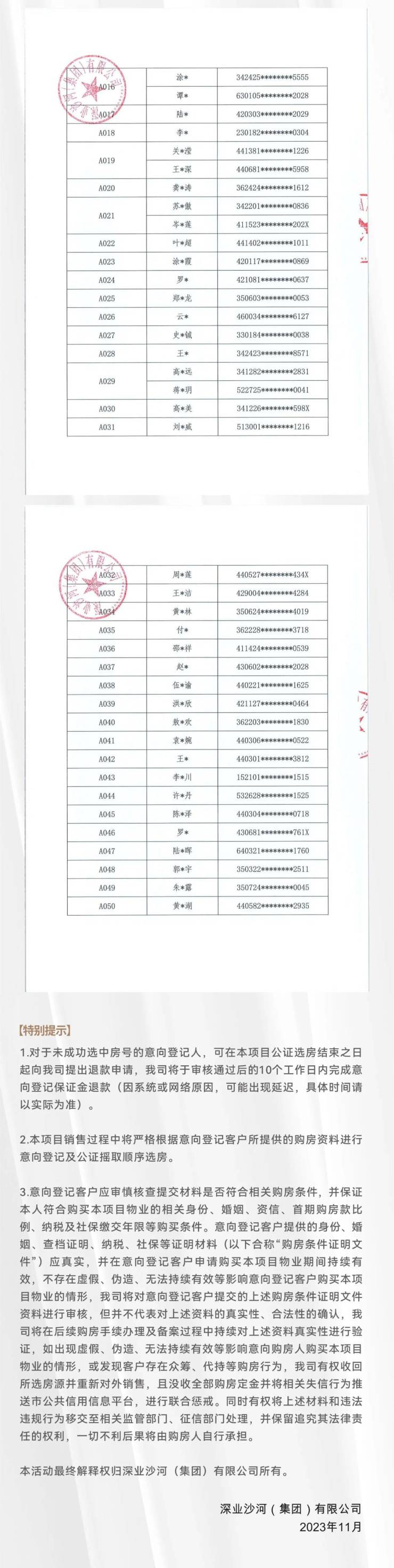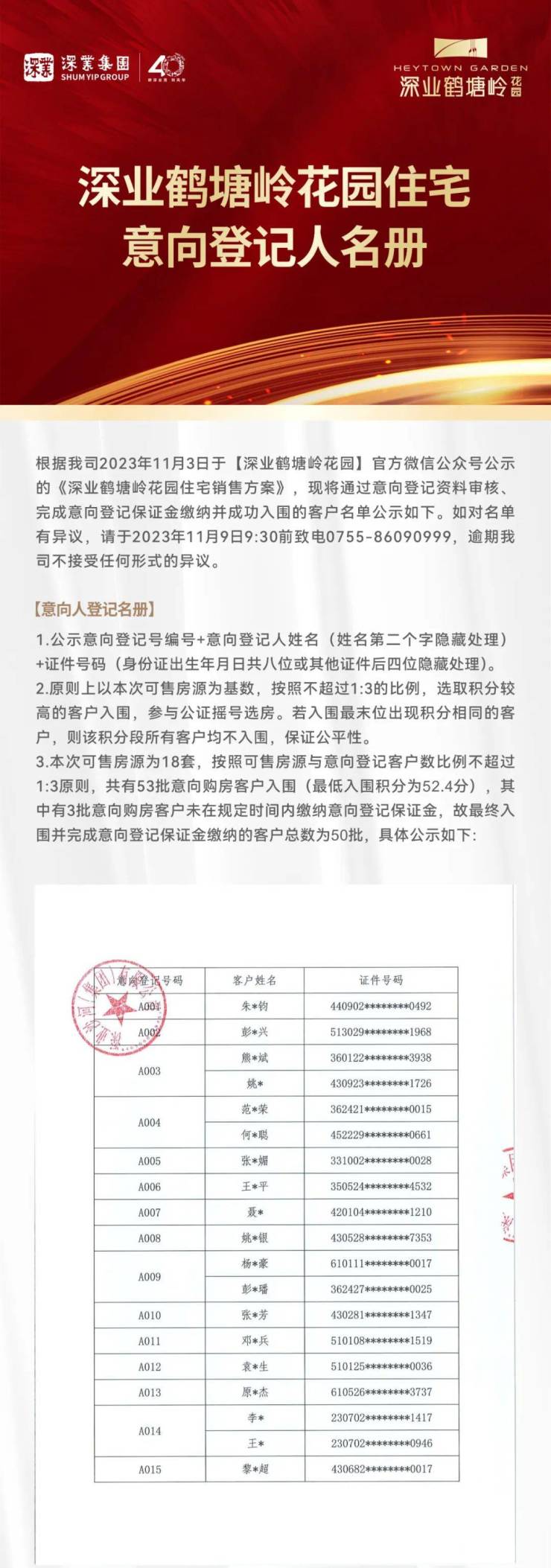 刚刚,南山深业鹤塘岭花园公示本批住宅意向登记人名册,共有53批意向购房者入围,最低入围积分为52.4分,最终50批客户缴纳保证金。本批销售18套现房,入围比例接近1:3。项目将于11月9日摇号,11月10日正式选房。