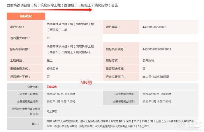 近日,据【家在】网友@NN丽爆料,《西丽高铁项目建(构)筑物拆除工程(西丽段)二期》发布招标公告。
