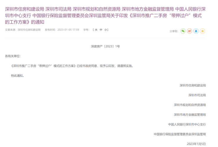 昨日深圳市住房和建设局等六部门印发《深圳市推广二手房“带押过户”模式的工作方案》的通知。