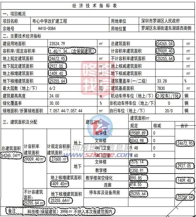 总建筑面积调整为约54265㎡,计容积率建筑面积调整为约29009㎡,地上计规定容积率建筑面积调整为约24673㎡(其中教学楼调整为约19590㎡,文体楼调整为约5064㎡),地下计规定容积率建筑面积调整为约2927㎡(其中教学楼调整为约1351㎡,文体楼调整为约1576㎡),地上核增建筑面积调整为约1409㎡(其中教学楼架空绿化面积调整为约991㎡,连廊面积调整为约418㎡),不计容积率建筑面积(地下核增建筑面积)调整为约25256㎡,容积率相应修改等;