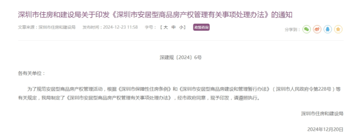 刚刚,深圳市住房和建设局印发了《深圳市安居型商品房产权管理有关事项处理办法》的通知,该办法自2025年1月2日起施行。