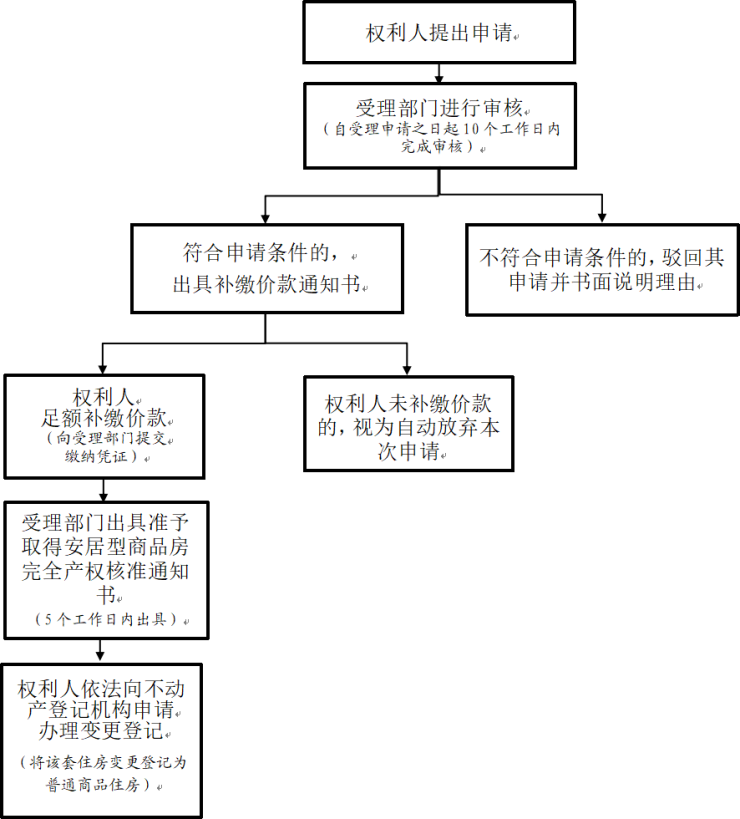 (四)补缴价款。权利人足额补缴价款后,向受理部门提交缴纳凭证,受理部门于五个工作日以内出具准予取得安居型商品房完全产权的核准通知书。