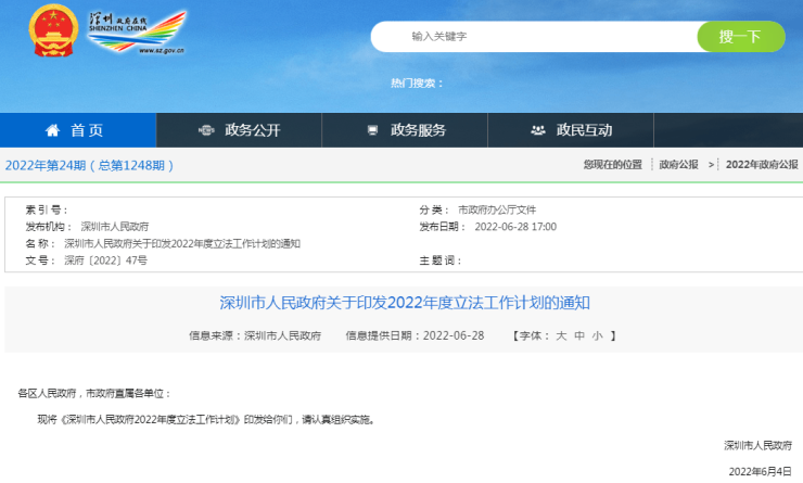 近日,在较新一期政府公报中,深圳市人民政府公布了《2022年度立法工作计划》。