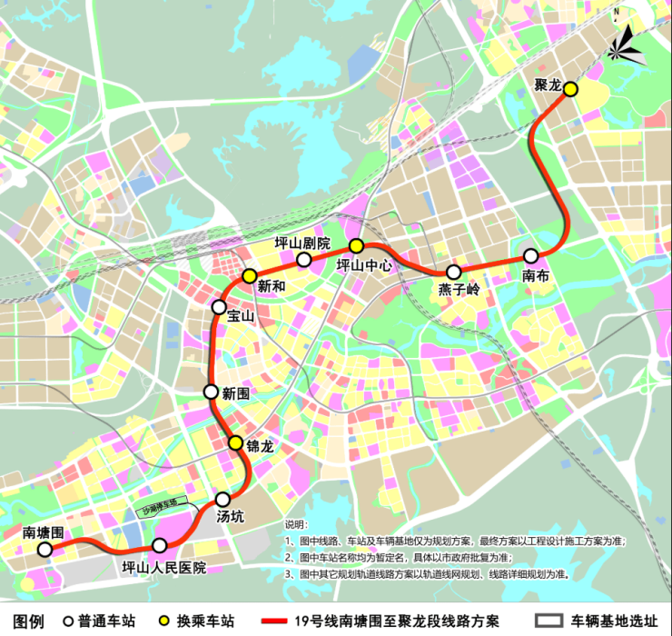 19号线一期全线位于坪山辖区,南塘围至聚龙段主要沿坪山区同富路、振碧路、兰竹西路、金牛路、锦绣中路等通道布设,线路全长约14.8公里,全线采用地下敷设方式,共设车站12座。其中有4座换乘车站,锦龙站、坪山中心站均与14号线换乘,新和站与16号线换乘,聚龙站与深大城际换乘。
