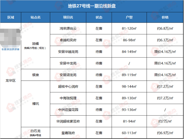 新盘价格方面来看,27号线龙华段的商品住宅价格基本是在6-7.2万/㎡左右,对刚需、改善置业人群相对友好;而人才房限价则在4.16万/㎡左右。