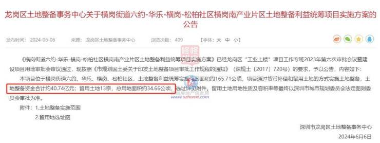 土地整备利益统筹项目实施方案显示,土地整备资金合计约40.74亿元;留用土地13宗,总用地面积约34.66公顷。