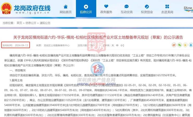 今年4月份,龙岗区横岗街道六约-华乐-横岗-松柏社区横岗南产业片区土地整备单元规划(草案)的公示对外公布。