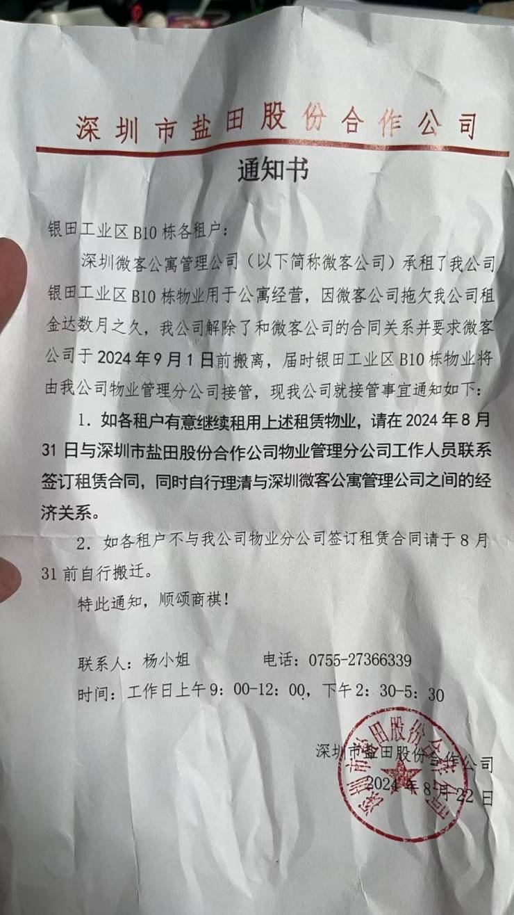 8月22日,盐田股份给微客公寓租户的《通知书》中称,因深圳微客公寓管理公司(下称“微客公司”)拖欠盐田股份租金数月,盐田股份解除了和微客公司的合同关系,并要求微客公司于2024年9月1日前搬离,届时微客青年公寓深圳银田站店物业将由盐田股份物业管理分公司接管。