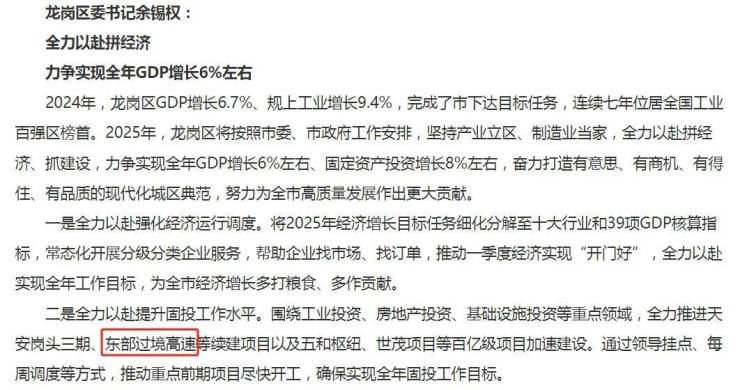 龙岗区在今年的政府报告的2025年工作安排中提到:“全力推进东部过境高速等续建项目”。