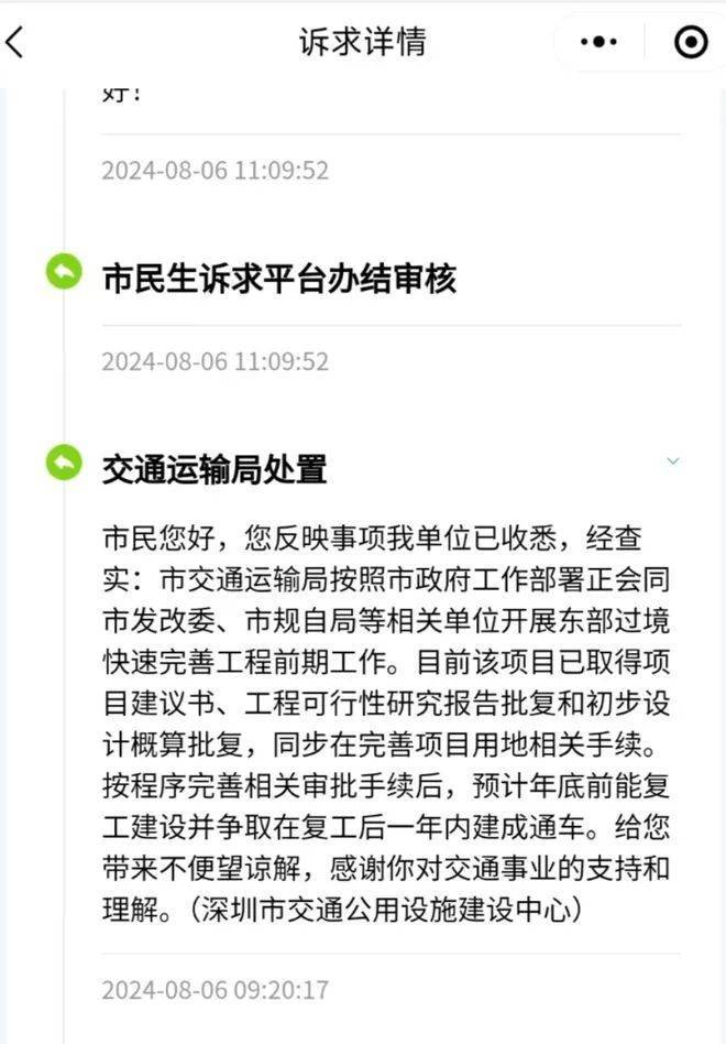 深圳市交通公用设施建设中心对此回复,相关部门开展东部过境快速完善工程前期工作,目前该项目已取得项目建议书,工程可行性研究报告批复和初步设计概算批复,同步在完善项目相关手续。