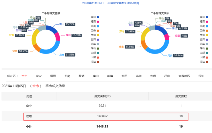 11月5日二手房住宅网签18套。宝安2套;福田2套;龙岗6套;罗湖4套;南山2套;盐田0套;龙华2套;光明0套;坪山0套;大鹏0套。