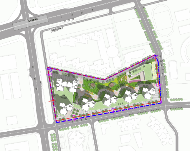 小区规划,由7栋23-48层超高层住宅楼、1座9班幼儿园以及部分商业配套组成。