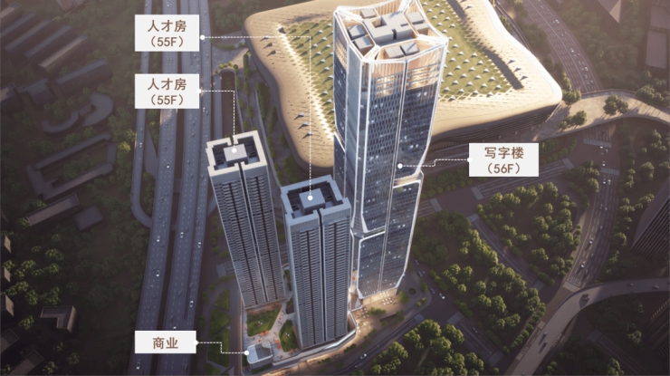 河套公馆总建筑面积近26万㎡,涵盖甲级写字楼,2栋可售人才房和购物中心裙楼。