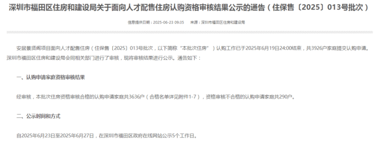 刚刚,福田安居景贤阁人才房认购初审名单出炉,96套房源吸引3926户家庭申购,最终3636户家庭合格入围,认购比近1:38。