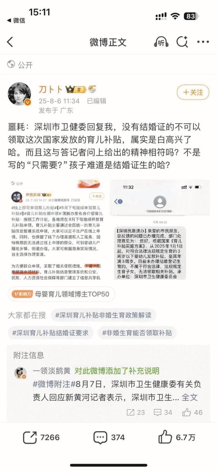 日前,国家育儿补贴制度实施方案公布,按照工作计划,各地将于8月下旬陆续开放育儿补贴申领。近日,有网友发文称自己收到深圳市卫生健康委的短信,被告知因未办理结婚登记生育子女,不符合法律、法规规定,无法申领育儿补贴。相关帖文立即引起网友热议。