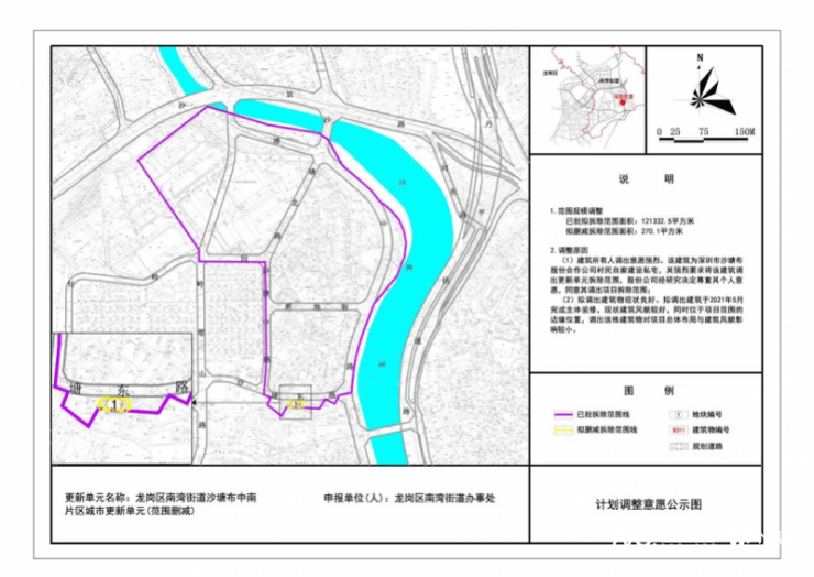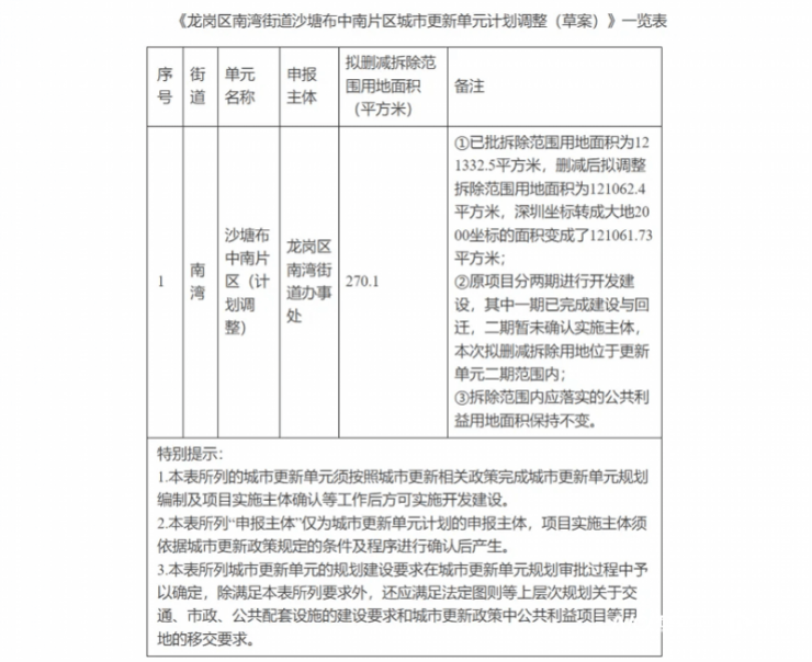 2023年8月21日,深圳市龙岗区城市更新和土地整备局官网公示了关于《龙岗区南湾街道沙塘布中南片区城市更新单元计划调整(草案)》及《龙岗区南湾街道沙塘布中南片区城市更新单元计划调整更新意愿》。根据公示信息,南湾街道沙塘布中南片区(计划调整)已批拆除范围用地面积为121332.5平方米,删减后拟调整拆除范围用地面积为121062.4平方米,拟删减拆除范围用地270.1平方米且位于更新单元二期范围内。