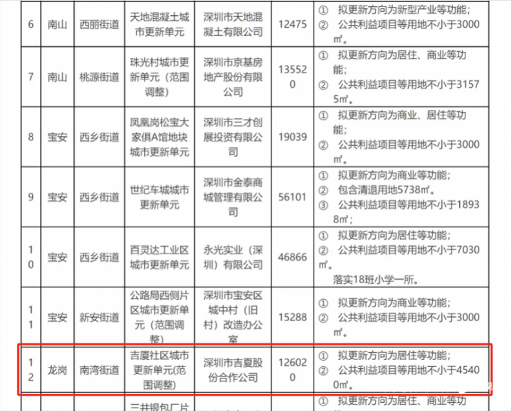 另据深圳市规划和自然资源局官网信息,2014年3月,龙岗区南湾街道吉厦社区城市更新单元(范围调整)被列入市规划国土委关于《2014年深圳市城市更新单元计划第一批计划》(草案),据公示内容,该项目拟拆除重建用地面积126020平方米,拟更新方向为居住等功能,申报主体为深圳市吉夏股份合作公司。