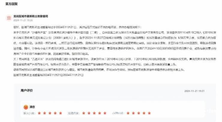 11月21日,龙岗区城市更新和土地整备局对该市民留言进行回复称,沙塘布中南片区项目(二期)正在进行规划调整,吉厦社区城市更新单元正开展盘活处置。接下来,该局将在城市更新进程中继续依法依规开展工作。
