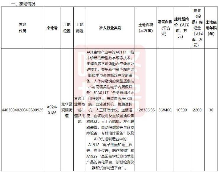 5月18日,深圳迈瑞生物医疗电子股份有限公司以起始价1.06亿拿下龙华观澜一宗普通工业用地+城市道路用地,建医疗器械标杆制造基地,综合楼面单价287.41元/㎡。
