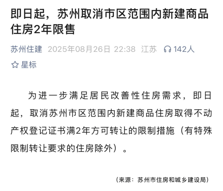 继上海松绑楼市政策后,隔壁的苏州也有行动了。8月26日晚,“苏州住建”微信公众号发布消息,全文如下:为进一步满足居民改善性住房需求,即日起,取消苏州市区范围内新建商品住房取得不动产权登记证书满2年方可转让的限…