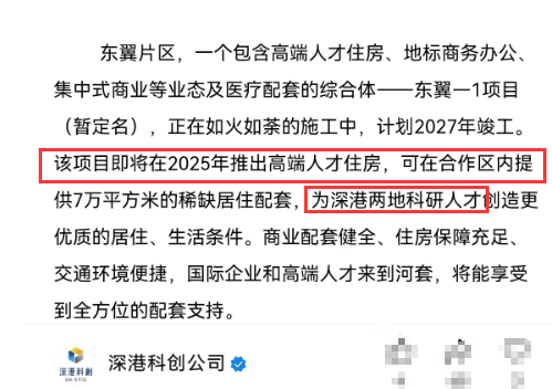 而在早前,官媒在介绍项目时也曾公开表示,深港科创东翼-1项目是为“深港两地科研人才”提供的居住配套。(具体以官宣配售公告为准)