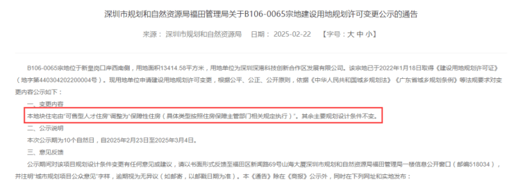 日前,市规自局发布了关于福田B106-0065宗地建设规划许可变更公示,地块由“可售型人才住房”调整为“保障性住房”。