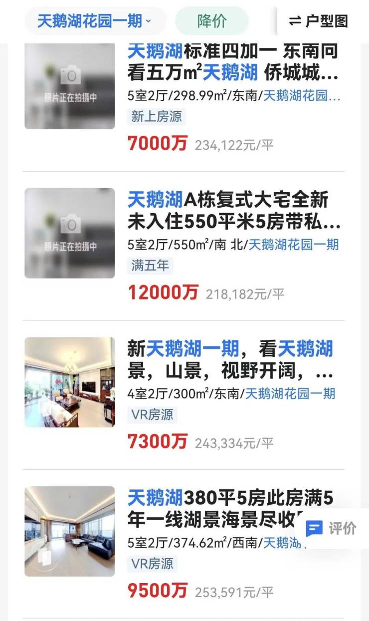 据贝壳找房APP显示,目前天鹅湖花园一期共有8套房源挂牌,其中最大面积的是550㎡的复式,挂牌价1.2亿,单价为21.8万/㎡。
