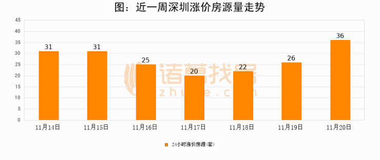 根据诸葛找房数据显示,深圳24小时涨价房源量为36套,较11月19日增加10套,环比上涨38.5%。与此同时,涨价房源占比小幅扩大,业主信心有所提升。