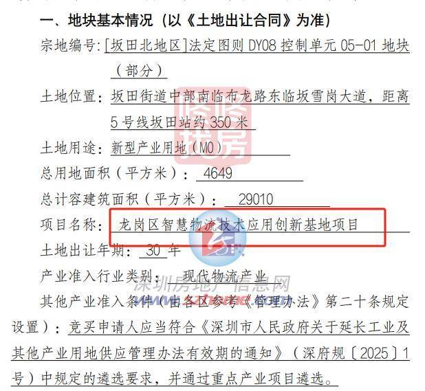 根据产业监管协议显示,该地块将建设龙岗区智慧物流技术应用创新基地项目。