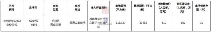 宗地号G08409-0101,土地位置龙岗区园山街道,土地用途普通工业用地,准入行业类别战略性新兴产业之数字与时尚产业,土地面积6132.37平方米,建筑面积21463平方米,挂牌起始价810万元,土地使用年限30年。