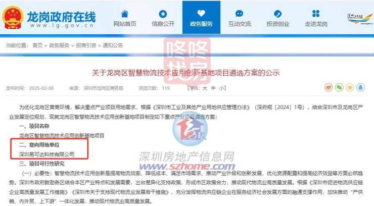 2月,龙岗区商务局公示《龙岗区智慧物流技术应用创新基地项目遴选方案》,意向用地单位为深圳易可达科技有限公司。