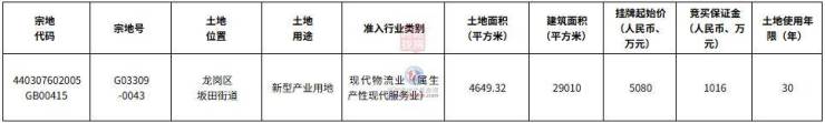 宗地号G03309-0043,土地位置龙岗区坂田街道,土地用途新型产业用地,准入行业类别现代物流业(属生产性现代服务业),土地面积4649.32平方米,建筑面积29010平方米,挂牌起始价5080万元,土地使用年限30年。