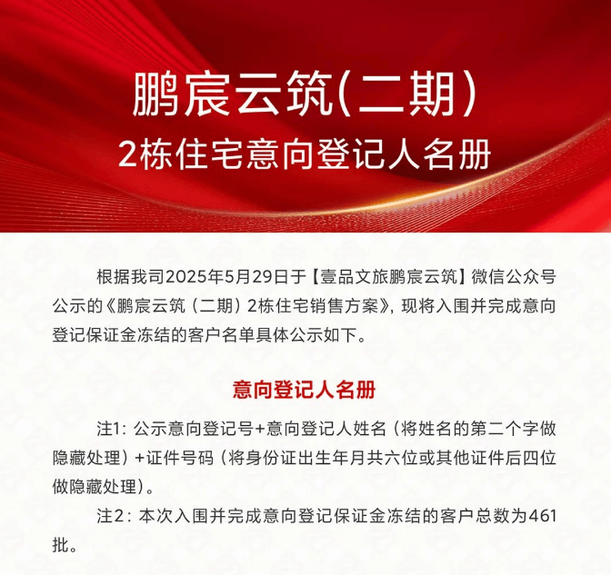 6月4日,鹏宸云筑2栋住宅意向登记人名册公示,项目此次共有461批客户进行意向登记,项目将于6月5日下午进行公证摇号,将于6月7日开盘。