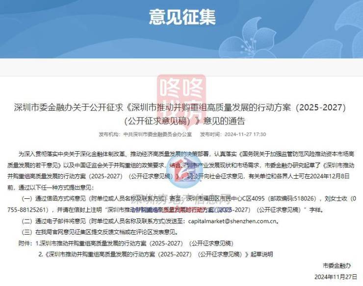 11月27日,深圳市委金融办发布《深圳市推动并购重组高质量发展的行动方案(2025-2027)(公开征求意见稿)》(以下简称行动方案)公开征求意见,也成为“9.24新政”出台以来第一个发布支持并购重组的城市。