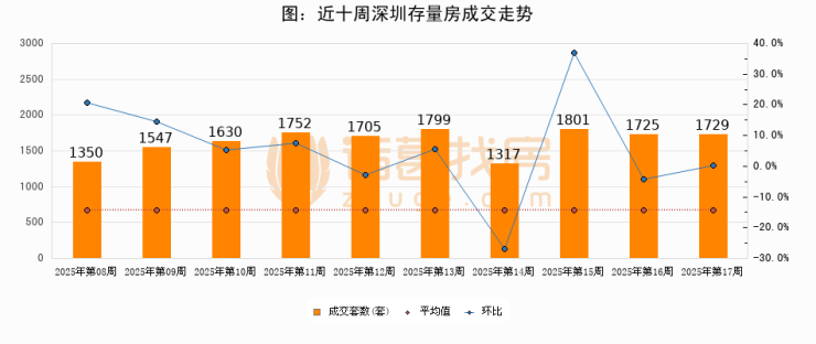 存量房方面,第17周深圳存量房成交1729套,较上周增加4套,环比上涨0.2%。从近十周成交走势来看,周均成交套数为1635套,本周高于平均水平5.7%。