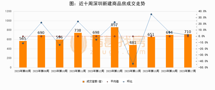 进入2025年第17周(04月21日-04月27日),深圳新建商品房成交710套,较上周增加16套,环比上涨2.3%